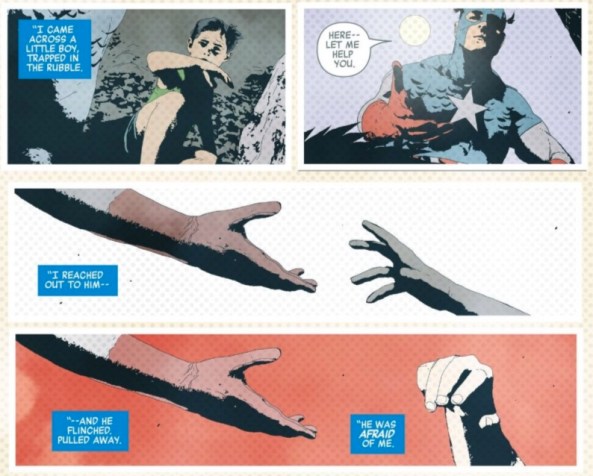 In the sequence, the background turns red as the boy pulls away from Captain America. The scars left from Hydra-Cap are not gone, especially to the most impressionable. There is a fracture between Captain America and the citizens of the country. Spencer sets the issue up as a dual betrayal. Captain America has abused the trust of the citizenry and the citizenry has disappointed Cap by moving so easily away from freedom and justice and into the arms of a dictatorship.