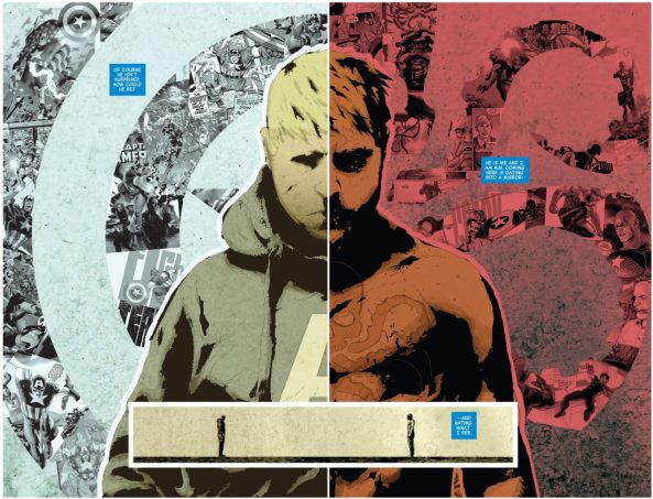 Sorrentino’s art presents the two men as some sort of twisted yin yang. The color palate here extends throughout the issue. It serves both a practical and a symbolic function. The colors allow us to tell the two Steves apart. At the same time, the red light used for Hydra-Steve evokes traditional demonic imagery and, along with the blue used for Steve, provides a bit of a patriotic air. Each of the Steves stands in front of their preferred symbols made up of key images from their lifetimes. The images are mostly action shots from battle, but there are a couple of cover images for Steve. The inclusion of these classic images helps draw the contrast between reality and media portrayal. Steve mentions the millions spent by Stark to rehab his image in an offhand way, but the images here confirms that memories are formed by impressions. Steve’s memories consist of going in to battle, victorious moments, and press clippings.