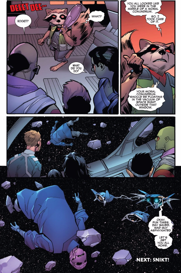 1. I will admit, I do like the joke of Rocket simply executing the guy. It would have been a great final joke in a better done story, that built up the elements meaningfully. As a skewering of the traditional ethical conundrums that make up the book