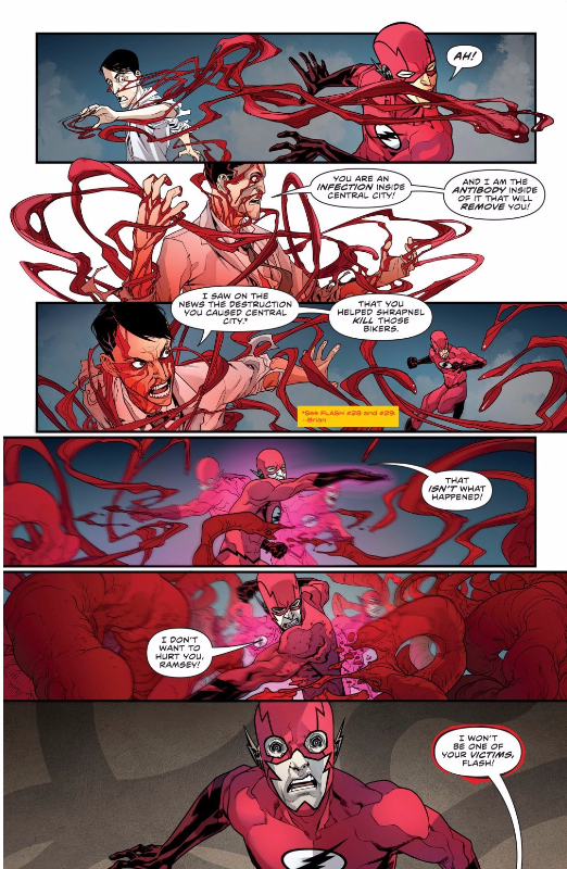 Ramsey the coroner, a.k.a. Bloodwork a.k.a. the villain of The Flash 30, never wants to be a victim again after a sheltered childhood hiding from hemophilia, and has only hurt or killed others in order to protect himself. That doesn’t absolve him, of course — the only real risk he’s facing is his own crimes being exposed, and he has zero remorse for any of his actions — but it does explain why he wants to hurt the Flash. Not only is Flash a personal threat to Bloodwork, but Ramsey also views him as a threat to all of Central City, something Barry, in his current self-pitying, Negative Speed Force addled state, would definitely agree with.