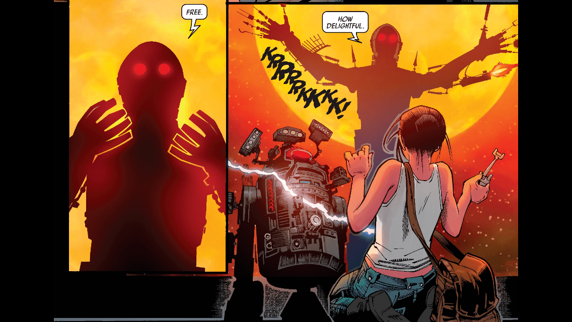 As if he wasn’t a menacing figure to begin with, Trip now has full autonomy to kill whomever he wants. After Aphra “frees” him, Kev Walker draws a nightmare image of Triple-Zero releasing his newly-freed weapons. Silhouetted by a burning sun behind him, this looks like the birth of a new and terrible monster god.