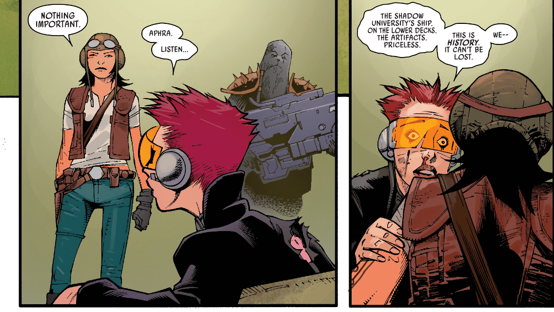 Reminiscent of Nazi Germany’s siege and destruction of priceless works of art, Aphra doesn’t want the Shadow University’s history to fall under the boot of the Empire. Art over Fear.