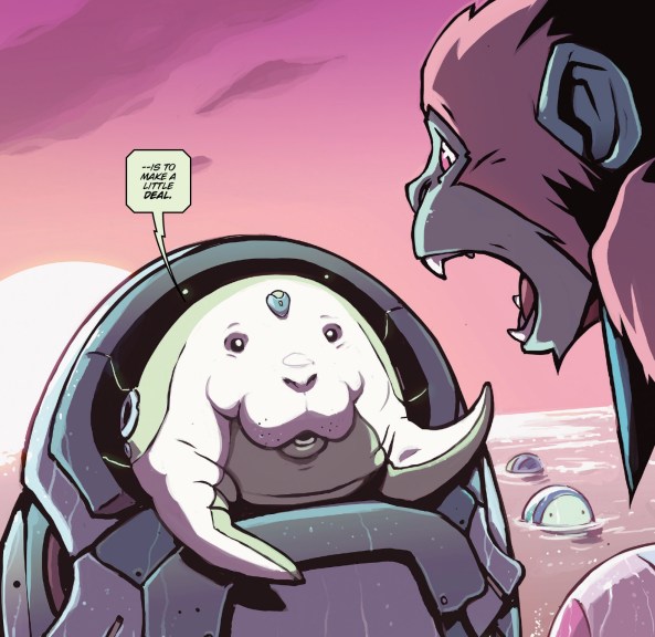 Another unexpected choice that ends up paying dividends is Wijngaard‘s decision to render the world as adorable and non-threatening. It’s initially jarring to try and determine the tone of the issue when the darkness of the material continually clashes with the Disney-like presentation. What do you make of a world where flying monkeys sporting Easter colors and jet-powered dolphins grapple with war and child brides and female genital mutilation (my read on the pregnant monkey’s wings getting cut off)? But the juxtaposition works in the same way it works for Watership Down or Animal Farm. Told “realistically” with humans, such material could easily become too heavy and depressing. With animals, there’s a certain amount of distance afforded the story, which allows Spurrier and Wijngaard an opportunity to go dark without feeling relentlessly bleak.