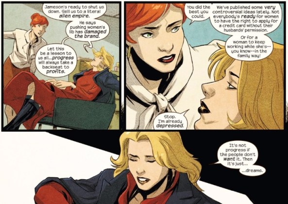 Kamala’s realization also helps her pen an article for Carol’s Women’s Magazine which saves it from being bought by the Shi’rar (in a bid to control human media). This magazine, and Carol’s struggle to keep it afloat, highlight another strong aspect of this issue. Wilson is sure to remind us that in the 1970s, life was still very difficult for women. Carol, who wants to cover important issues on feminism, struggles with a world that is at once hostile and apathetic to what she has to say.