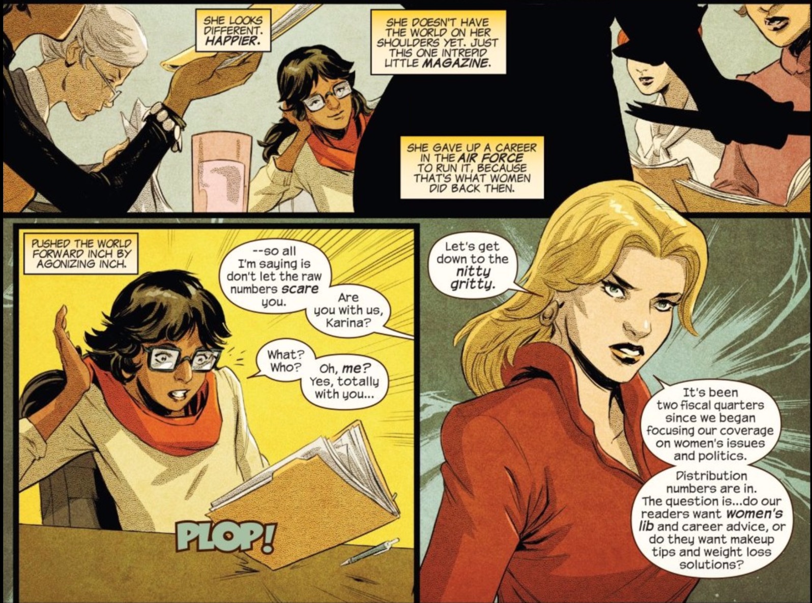 Kamala’s realization also helps her pen an article for Carol’s Women’s Magazine which saves it from being bought by the Shi’rar (in a bid to control human media). This magazine, and Carol’s struggle to keep it afloat, highlight another strong aspect of this issue. Wilson is sure to remind us that in the 1970s, life was still very difficult for women. Carol, who wants to cover important issues on feminism, struggles with a world that is at once hostile and apathetic to what she has to say.
