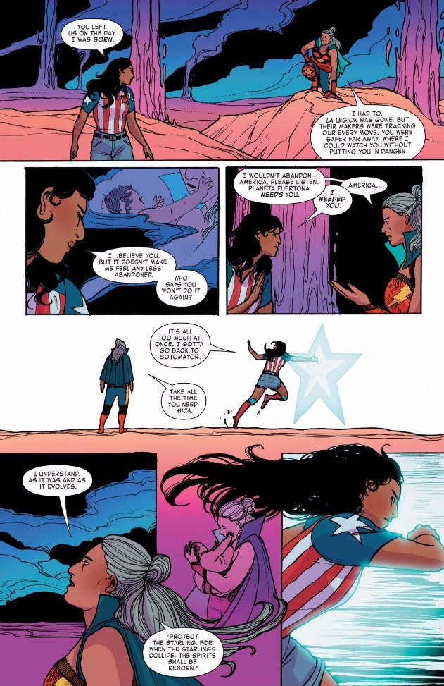 While it’s bubbling beneath the surface, that’s the real conflict Rivera is seeding here. Madrimar all but outright states that it’s America’s destiny to protect Fuertona — she’s the Starling, the strongest Fuertona — but America’s made her own life on Earth. I’ll admit this idea suffers a bit from America‘s occasional over-ambitiousness — we’ve barely spent enough time at Sotomayor to really get invested in it or America’s choice — but after a series that’s mostly seen America reacting to events that have pulled her willy-nilly across the multiverse, the idea that America has a choice to make about her future, that she can again take control of her own narrative, excites me.