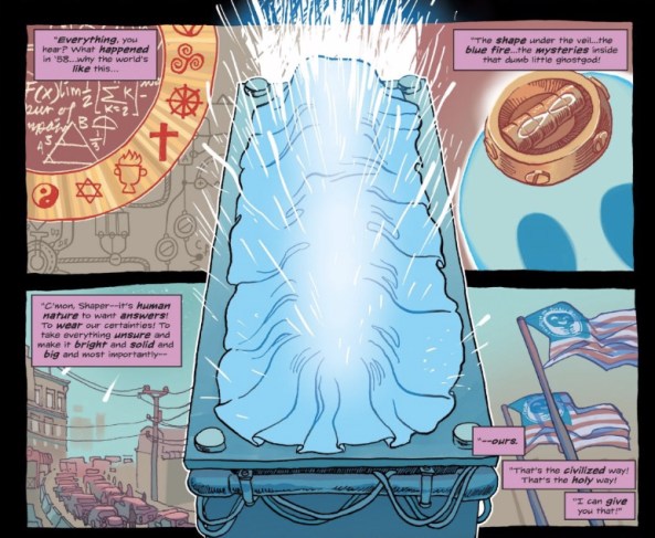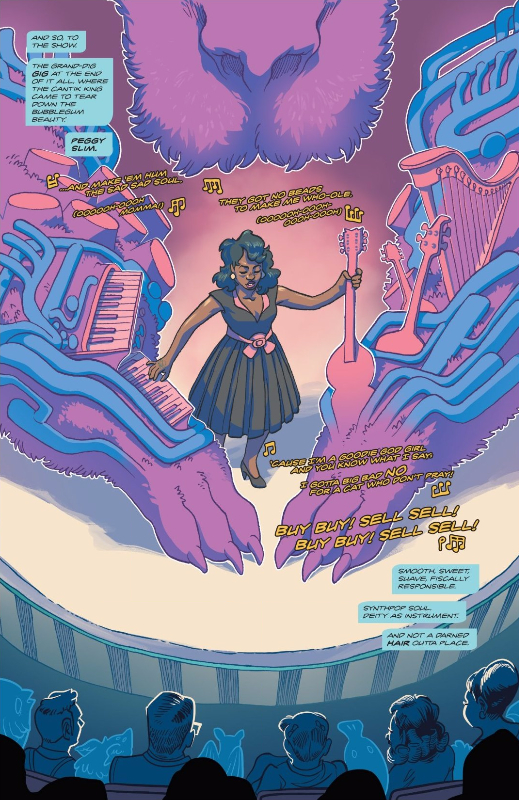 This is the very first page of the issue, and already Peggy Slim’s song is making the link between materialism and religion crystal clear. That really should have been obvious from the start — after all, prayer is used to transfer currency in this world, and the bigger the god, the richer the owner — but what hasn’t always been clear is the way this dynamic feeds materialism. In a world where everyone has a god, holiness is top priority, and when that god is a constant reminder of one’s wealth, then it’s easy to decide that wealth=holiness.