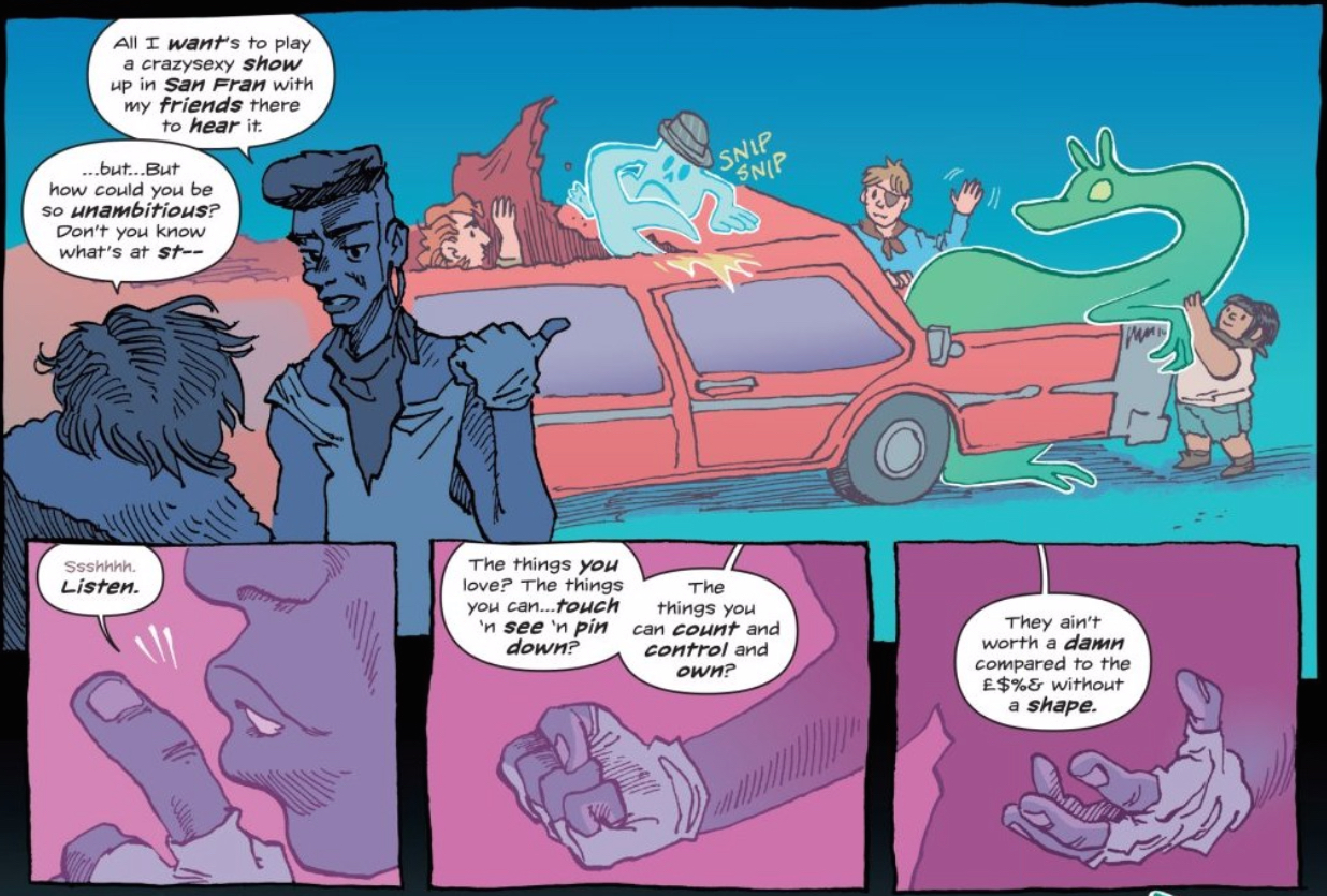 Ennay laments what we might understand as “selling out” before Bud helps him find a new way. And it’s that new way that really grabs me. “Something. New.” We haven’t seen that kind of white-on-black text anywhere in this series before, let alone happening in the gutter, which gives it a mysterious kind of authority. Are these Bud’s words, or some kind of irrefutable truth the universe is taking notice of? All we know is that what happens next hasn’t ever happened before.