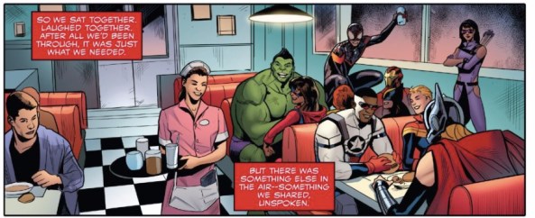 That segues into Sam handing the role of Cap back to the never-Hydra’d Steve Rogers. Ryan, I think that’s where the metaphor starts to cut the most deeply. Sam has sacrificed and fought as a symbol of American exceptionalism for a life-time and a half, and kicking the shield back to Steve feels like a call to arms, doesn’t it? The generations before us already made their sacrifices, and anything that is better now is because of them. Comics, like history, will always barrel forward. Are you ready to see Steve behind the shield again? Are you ready to see Sam move on? You think anyone else — besides Thor, who seems to be able to sense it — has any idea that Sam experienced like 70 years all at once? Also, will someone tell Miles to get the hell of the table?