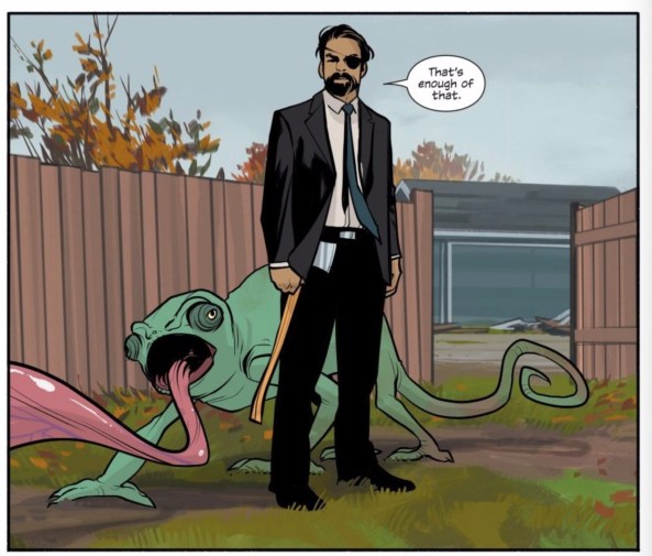 The other two memories are less obvious choices in a “This is Your Life” reel. We see The Will slaughtering a parking garage full of Rowell-looking aliens while The Stalk offers a fumbling come on, then Gwendolyn bathing as The Will acts like a gentleman. Because neither of these scenes are as clearly impactful, they inspire a closer reading. Vaughan and Staples had to know this. They framed the series as a story told by an adult Hazel, her perspective coloring the events that she shares.