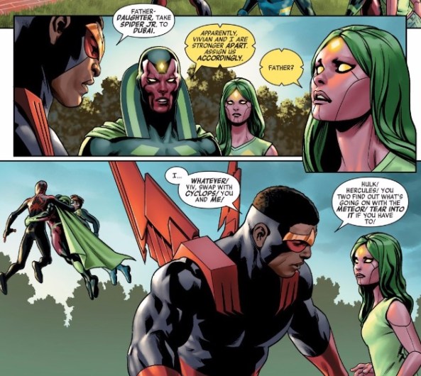 Their conflict is best represented by the Vision and Viv, whose argument early in the issue leads to Vision deciding that it would be best for them not to work together in the field.