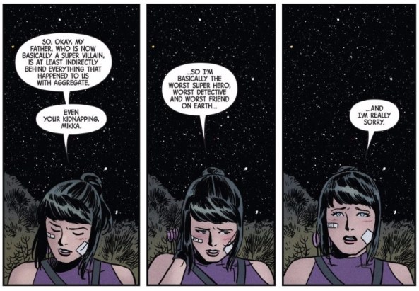Kate Bishop always has bandages on her face. Look at those two panels leading up to that statement: bandage, bandage. The bandages are actually surprising loaded imagery, as it does more to link Bishop to a totally different crappy father figure – Clint Barton. The identity of Hawkeye, and the attendant heroism, is the life she chose and not the life she was born into. Additionally, each bandage represents a wound she sustained being a goddamned hero (again, just like Clint). You know which Kate is the real Kate because you can see the marks of her good deeds right there on her face. It’s vulnerable and it’s honest.