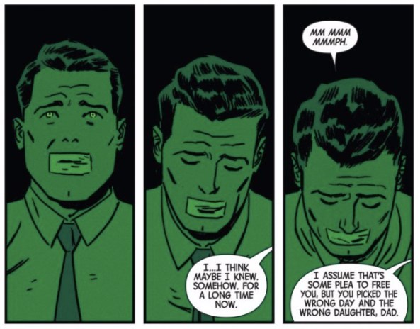 Patrick, I really liked this issue because it so delicately explores Kate’s feelings without ever becoming maudlin or sterile. Kate’s relationship with her father reminds me of ancient myth, only reversed. The fear she has of becoming her dad is real and perhaps the most heroic thing about her is her struggle to not let that happen. That being said, how did you feel about this issue? Where do you think Kate goes from here? Do you totally buy the idea that she could ever become her father? And with you living in LA, I’m wondering if you’ve ever fought someone on the Hollywood sign. It seems like a right passage for any Los Angeles resident, if comics and movies are to be trusted.