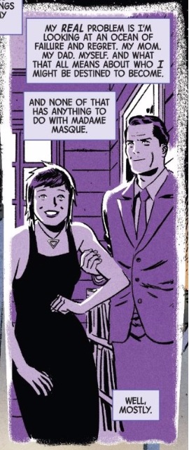 That’s how I’d always seen Madame Masque in Hawkeye. Which isn’t to say she isn’t a great villain (she is), but that everything that has been done to make her a great villain for Kate was done through relationship building in Fraction’s run. What Thompson does so well in really dig into her history and parallel it to Kate, making her more than just a great villain, but the perfect dark mirror.