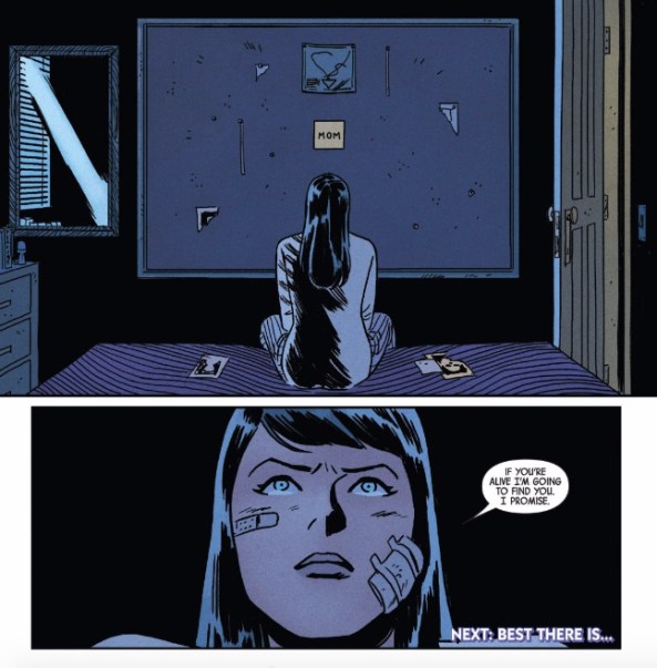 Which has me pumped for the turn at the end of the issue. Kate moves on to something closer to what she actually wants: finding her mother. She pulls the “Derek Bishop” index card off the board, ripping it in half with thumbtack still in the cork board, and replaces it with a post-it note that simply reads MOM.