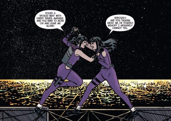 Also, Quinn would have been completely the wrong relationship. It has been clear that despite Quinn being attracted to Kate, Kate doesn’t think of him that way. And tat jealous look at the end of this issue wasn’t the first time that Quinn has been a little… problematic. I think the fact that he doesn’t get the girl is supposed to be the point, and his story will be about what happens when a guy like Quinn has to deal with that. I’m not sure Quinn is a good guy