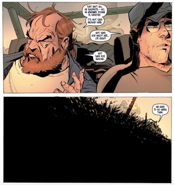 That last panel is basically all blackness. But it’s not any character lie that Bergara is emphasizing here, but the lie that Young and Buccellato are telling us. “We need to go warn them.” That sounds like they’re going to be helpful right? Before the issue is over, Jolene will be gunned down in bed.