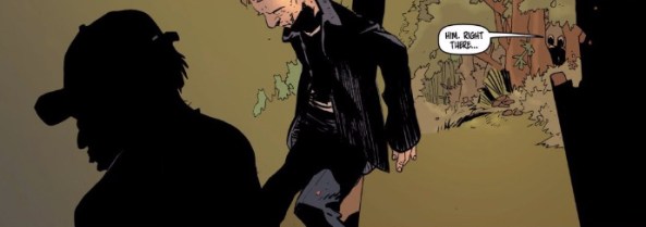 The most obvious carrier of this second sickness is Sheriff Earl, whose son, Daryl, has been eating people for years. Earl keeps his son employed at the police station and gracefully deflects inquiries about his well-being with a folksy “same as always.” Of course, writers Brian Buccellato and Jennifer Young’s words are masterfully supported by artist Matías Bergara. Bergara starts to creep encroaching shadows onto the page as the deliberate mistruths start to tumble out of these characters’ mouths. Sometimes that means casting characters in silhouette, sometimes it means putting a large obstruction in the foreground, and sometimes it means letting the camera drift away from the action. Here’ my favorite example of Bergara leaning in to the obscuration of truth: