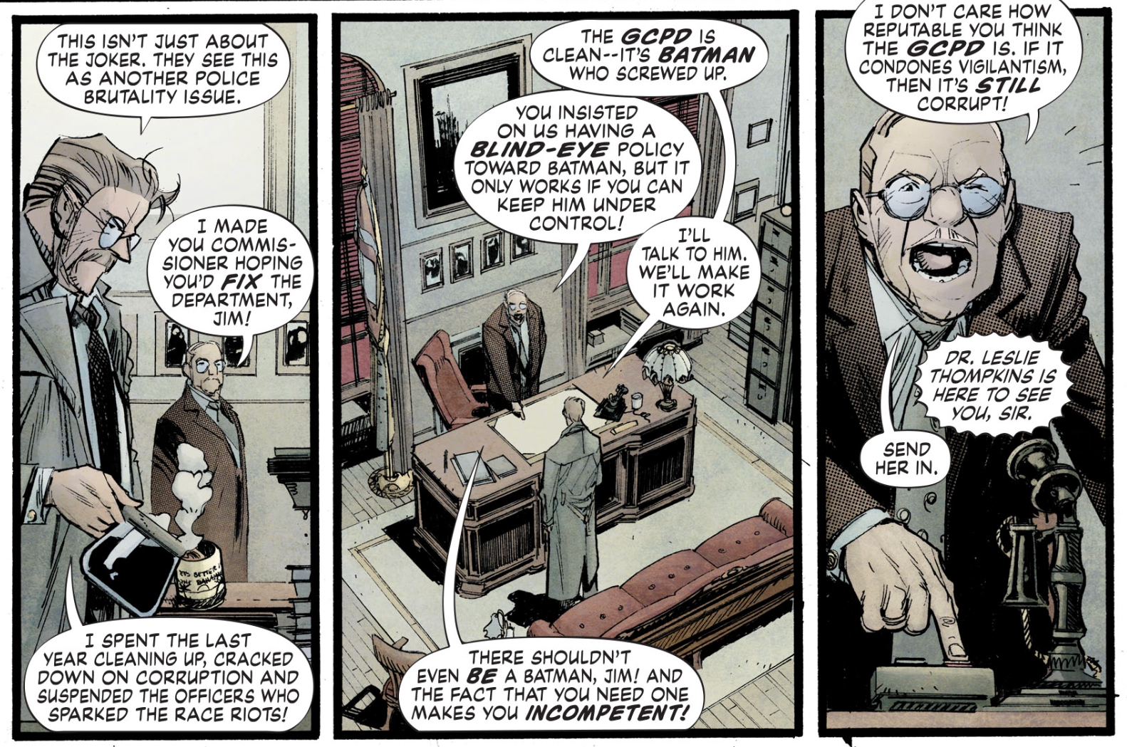 I mean, the problem with police brutality is that it is institution wide. There isn’t just one bad apple, but a systemic issue. How can you adequately address police brutality if you take everyone else off the hook. Other than the Joker being the lead*, the fundamental premsie of this book is a good one. But that requires honesty. And that means not handling the characters with kid gloves, letting characters be good guys out of a need to cuddle the characters, be unwilling to truly commit. This story can’t work if you try and sugarcoat the issues so that you don’t write your favourite supporting cast members too unsympathetically. The problem isn’t that people like Gordon have one particular officer they protect. He problem is that people like Gordon are completely unwilling to address the problems throughout the police. That no matter who is responsible, no action is taken. To suggest otherwise, to suggest that in a majority of cases, people like Gordon are handing down punishments, is to trivialize the topic completely. It ceases to be meaningful or real, merely an exploitative edgelord fantasy about why the Joker is just the coolest.