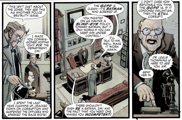 Wait, if this is a book that is supposed to be discussing police brutality, why is Commisioner Gordon generally a reformist that has actually attempted to address the problems in the police force? That is so hideously wrong it isn’t funny.