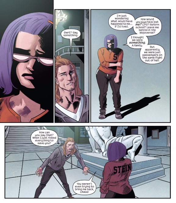 Chase, at the moment, is in some ways the wisest of the group, for once. He identifies the problems, reveals the truths. I described last issue as a story about how the Runaways are a bunch of adults who peaked at High School, and Chase is the one who realised that. Going back in time to resurrect Gert wasn’t the wisest move, but it came from an understanding of the problems they face. Where Nico tries to avoid, lock things up, Chase ahs confronted them. It lets him generally be honest.