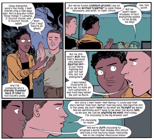 Doreen’s beliefs are so strong that they can’t help but rub off on others, even Stefan, who has previously been brainwashed by Dr. Doom. This in turn helps him to motivate the programmers Ultron has forced to work for him upon threats of death.