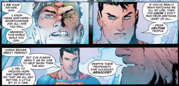 For simplicity’s sake, comics tend to paint large groups or alien races with a broad cultural brush (“On Tamaran we all follow our hearts and live by our emotions!”), but in reality, entire races or civilizations can’t be that simply summed up. In all honesty, Superman claiming that humanity are better than their base instincts is just as ridiculous as Jor-El saying that humanity are no better than their base instincts — both are trying to sum up six billion people with one easy label that will never be applicable to them all. Both have made a choice to see humanity in a way that reaffirms their worldview.