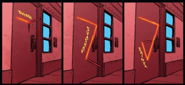 One more example of the visual power of that red sword and then, I swear, I’ll leave it alone. When Karai approaches the door to Toru’s panic room, he’s talking such a good game about how impenetrable his security is. The door, it would seem, cannot be broken down, and Karai will have to finish this with greater effort at a later time. But the sharp angles of that scarlet blade don’t obey the rules of decorum that govern the Yakuza. What follows is like a cool, graceful version of that scene at the beginning of Phantom Menace as Karai’s blade slices a clean, angular portal through the impenetrable door.