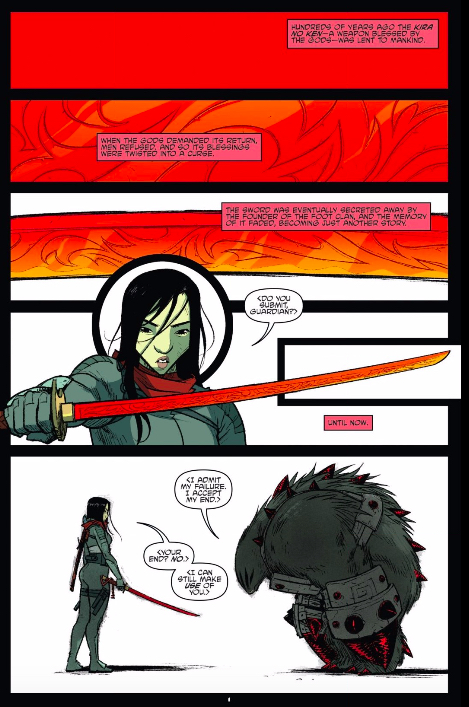 Patrick: She may have surpassed it. What Karai has, and what is bestowed upon her by the Kira No Ken, is a simplicity of design that Shredder never had. Drew already pulled my favorite pair of panels from the issue: the moment the red of the cursed blade manifests itself in the character herself. It’s possible that what I’m responding to isn’t the design aesthetic of Karai, so much as it is the design aesthetic of the sword. Hell, I get the feeling on the first page that Campbell and colorist Brittany Peer are trying to show us that this issue is about the Kira No Ken.