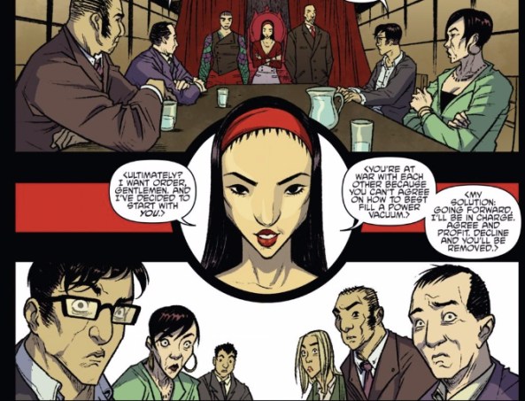 The red also makes for a handy trigger for grotesque violence, which is precisely what Peer is foreshadowing in the image above. This team makes maximum use of that, dropping out all other color in moments of extreme violence, as when Koya, Bludgeon and Ocho really lay into Hayashi Toru’s goons. Burnham turns up the violence in Ocho’s rhetoric straight to 10 with the crystal clear “Don’t talk. KILL! KILL EVERYTHING.” And that “kill everything” panel is really the height of stylized craftsmanship from nearly everyone involved. Peer strips away not only all colors besides back, white and red, but also all shading and lighting. Letterer Shawn Lee starts to break his speech balloons on the previous page, exaggerating the size of Ocho’s words, before finally popping the balloons here.