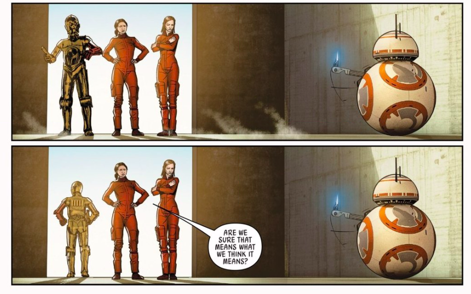 Also, I’m not sure the BB-8 lighter trick is about subculture differences, and more about ambiguity of action. The fact that BB-8, by virtue of being an astromech droid, cannot easily replicate human cultural signs. The joke is that we don’t know what meaning BB-8 ascribes to it, but the reason we don’t know is that it could justifiably be both a thumbs up or a middle finger. And as he uses it in situations where he could justifiably doing both, nobody knows and the debate rages on