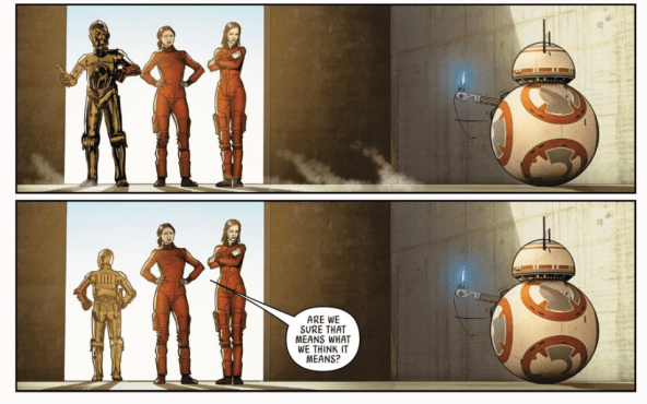 Followed by a sequence explaining droids’ “obsessions,” Angel Unzieta draws a quirky scene that introduces us to BB-8’s new boyfriend/girlfriend/pleasure unit IVEE. I’m sure there will certain corners of fandom that will be outraged, but I say “God bless.” The fact that we don’t directly hear/see what a droid is saying leaves much of said romance up to the imagination, which is great.