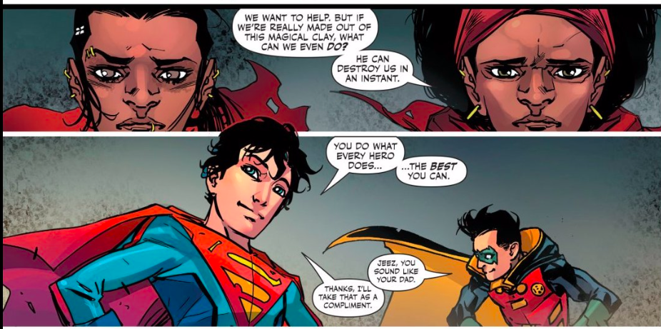 Superman is super not because of his laser eyes, his mighty pecks or his punchy fists. Superman is super because of his good heart. The best use of this heart? Super speeches. In Super Sons 9, Superboy follows in his father’s footsteps.