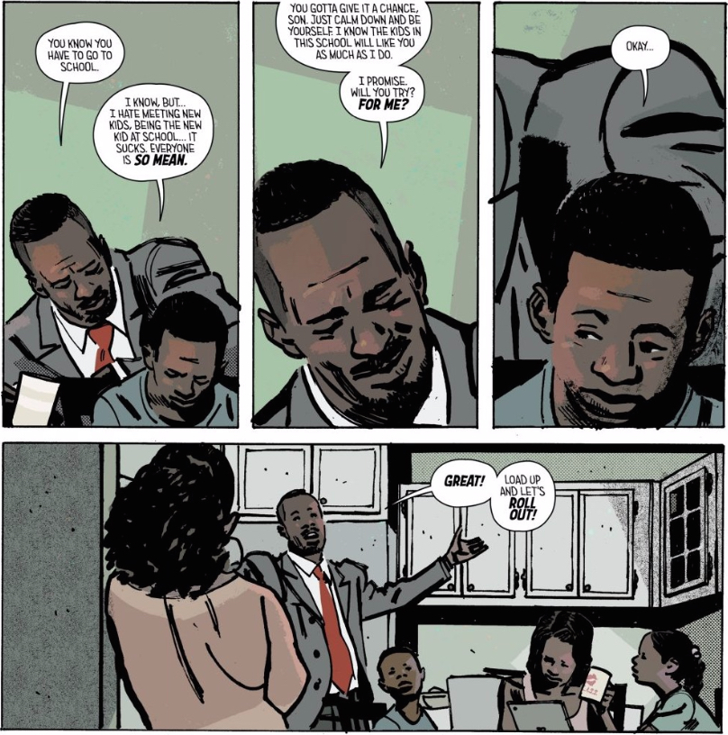 Robert Kirkman and Paul Azaceta start as far from that violence as they can, giving us a glimpse of Tusk’s banal familial duties, taking his anxious kids to their first day at a new school.
