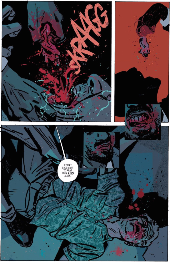 Cutting off (or ripping out) a liar’s tongue is a classic villain move, a symbolic overreaction to a smaller slight. That would be a shocking enough move to remind us that Tusk is closer to a mafioso than a middle manager, but Kirkman and Azaceta take it further, having Tusk eat the tongue raw. I’m not sure that has any meaning beyond being shocking and gross, but I’m not sure it needs to. As familiar as Tusk’s home life may be, we can’t presume to predict his actions. His morality is not our own.