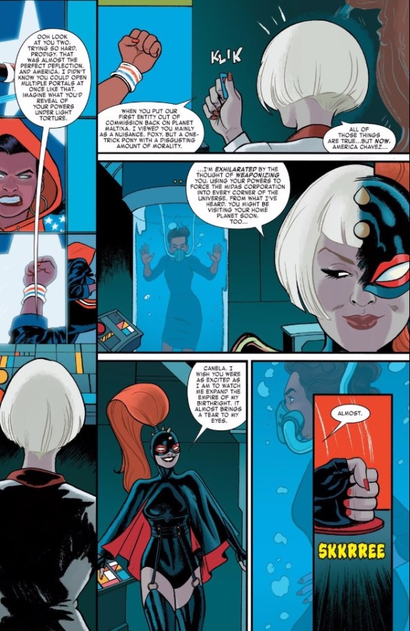 What I find most fascinating about this is that there’s no real history between Oubliette and America themselves (the Oubliette who appeared in the pages of Young Avengers was a projection of Leah/Loki’s guilt, not the real deal) — Oubliette has targeted her almost at random, simply because America just-so-happened to interfere in one of her plans and displayed powers that would be useful to her. The fact that Oubliette — the wealthy white heiress — is trying to claim the ancestral abilities of America — a Latina lesbian and essentially an inter-dimensional immigrant — as part of her own birthright can’t go without stating. It’s a rich, sadly-relevant dynamic, and I hope Rivera and Quinones mine it for all its worth.