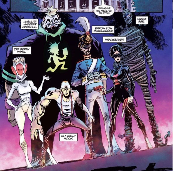 “Alt-Right Hook” is a Venture Brothers-caliber joke, brimming with a necessary irreverence. This group of villains represents counter cultures and fears from right fucking now. One of them is called Death Panel! The pairing of Alt-Right Hook and the Juggalo recalls the march from September this year. That happened just a hair over a moth before this issue was released, so it might just be fortuitous timing and Nitz and St. Claire’s part, but holy cow does that feel current.