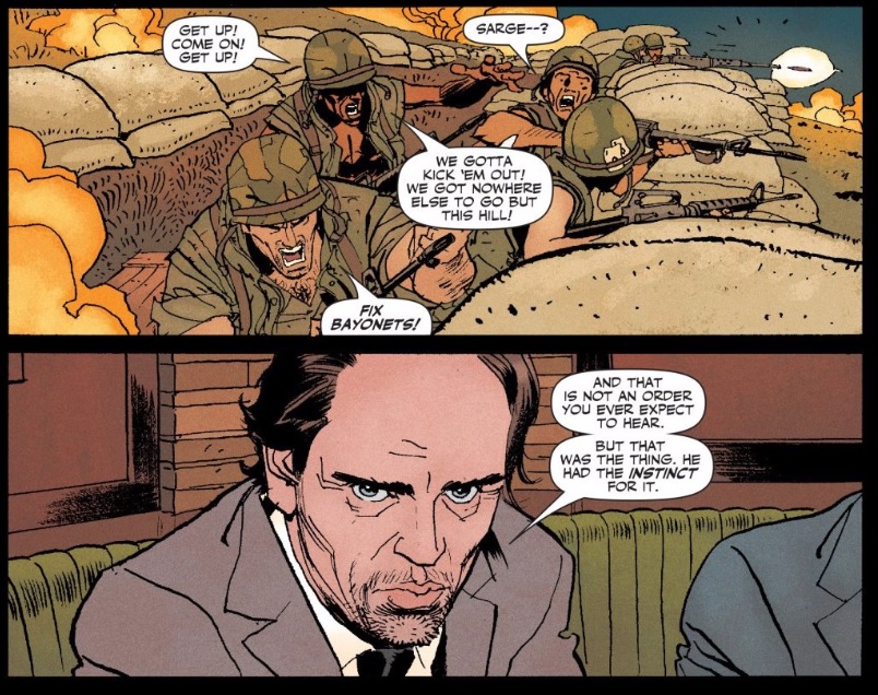 Castle’s platoon is dumbfounded when he orders them to have their bayonets at the ready. That’s when they see the real Frank Castle: animalistic and wild, yet protective of his brothers in arms. One of the veterans recalls that battle and the way they “let the devil in the door.” Its widely speculated that the closing of Ennis’ Punisher: Born, Castle makes a deal with the devil to slay overwhelming enemy forces. In Punisher: The Platoon 2 we see that the devil might be in all of of Frank’s platoon.