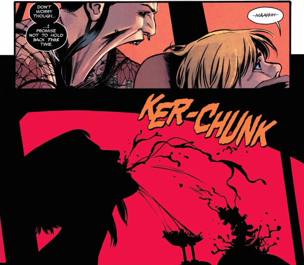First off, I love that Zub and Morissette-Phan have come up with a totally different design for this monster — it suggests a larger, weirder mythology behind whatever is going on here. But the thing I love most about this sequence is that, in it’s eagerness to eat Chelsea’s head, the monster also eats most of the headrest. That little detail sells the violence and viciousness of the attack more than the arcs of blood or dangling spine. This monster isn’t even delicate enough to eat only heads.