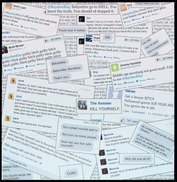 There are the classics within the deluge: both the ubiquitous “KILL YOURSELF” and the pithy, one-word message “CUNT” make all-caps appearances. But so do the messages that start off sounding like uncomfortably aggressive compliments and quickly morph into rape and death threats. This is the public’s reaction to Kaydon sincerely expressing emotions on television. Chelsie, the Newswire reporter who put the whole thing together is probably also going to be the target of some similar vitriol, but as she’s not the one offering her own emotions, she’s not nearly as concerned. It’s a damn chilling moment when her producer puts forth the concern “we’re going to get complaints,” only to be met with a cold “what else is new?”.