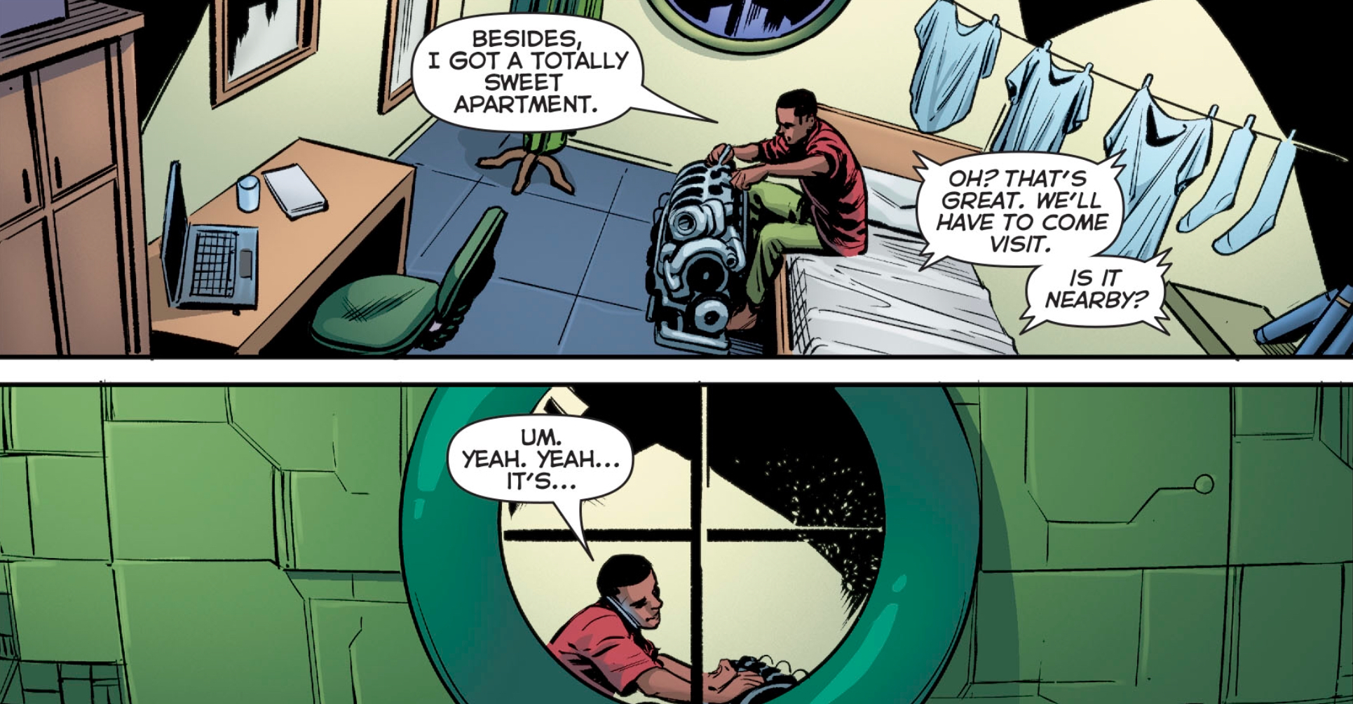 With his first two issues of Green Lanterns, Seeley has done an impressive job of laying out what it is that makes Simon Baz and Jessica Cruz unique, and valuable, members of the Green Lantern Corps. Superhero dual identities are often a case of having one’s cake and eating it too — billionaire playboy Bruce Wayne and vigilante crime fighter Batman and go-getting reporter Clark Kent and otherworldly perfect specimen Superman spring to mind — but for Simon and Jessica, life behind the ring is easier than their real world lives, lives where they aren’t even trusted with menial jobs. One minute they’re flying around the galaxy saving entire civilizations, the next they’re using their ring to set an alarm for 5 in the morning so they can get up and work in the kitchen of a coffee shop.