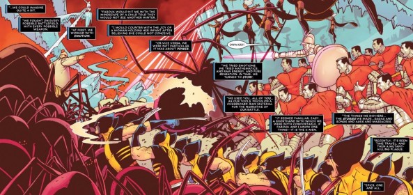 Charles says that these battles take the form of math equations, emotions, and finally stories. In these stories, they told epic tales of an army made up entirely of Wolverines fighting an army of gigantic spiders and so other such wildly crazy stuff. That idea is awesome, but it’s also where Soule misses his chance on commentary. The idea of Charles and the Shadow King telling stories about the X-Men is the perfect basis for some sort of meta-commentary on the importance of story telling, comics, and the X-Men franchise itself. Unfortunately, after introducing this enticing idea, Soule takes the narrative in a different direction and his chance at a great issue with it.