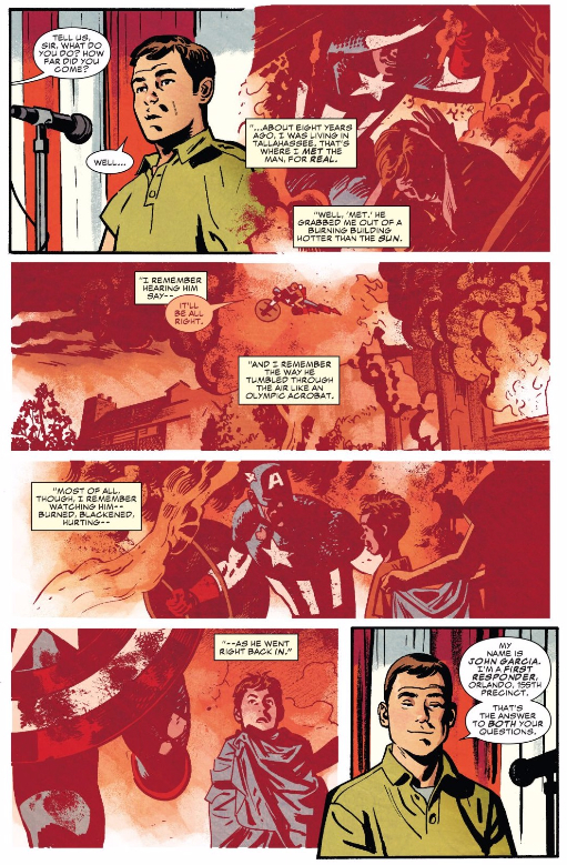 This issue shows Cap at his best — powerful, humble, brave, compassionate, and resolute — and it’s easy to see how that’s affected people. There’s the old woman who just finds hope in Cap, the man in the image above who was inspired to follow in Cap’s footsteps, the young girl he rescued 10 years ago who has made his rule to “protect those weaker than you” into the foundation of her life. Cap stands for something, and that resonates with fans both in the Marvel Universe and in real life.