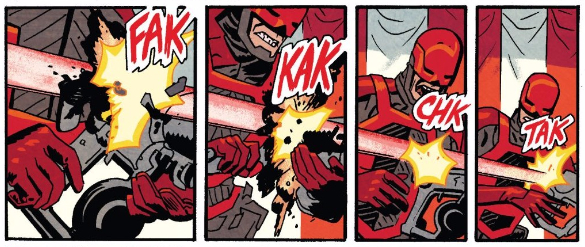 This moment is simple, but really stood out to me. By breaking up one movement into four small panels, Samnee is able to effortlessly portray the speed and progression of Cap’s shield, hitting each Rampart soldier only an instant after the last. Later in this same scene, the Rampart soldiers dogpile Cap, with each panel getting smaller and smaller as more goons crush him until Cap suddenly breaks free in a full-page splash. It’s yet another masterful use of space to show movement and power.