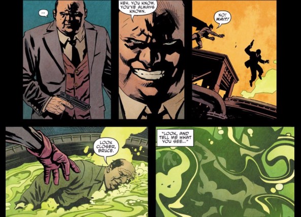 The remainder of the issue bops Batman around to different versions of hypothetical Batman-futures (man, I wanna read that Mayor Joker story), but Bats keeps willing himself back to the story of the Chemical Syndicate to get his own history “right.” But that’s where the tension I mentioned before comes back: in Detective Comics 27, Batman punches the villain right into a vat of acid and then smirks “a fitting end for his kind.” Even in getting the story “right” (i.e., as it was originally presented), the story is wrong (i.e., not consistent with what we know about modern Batman).