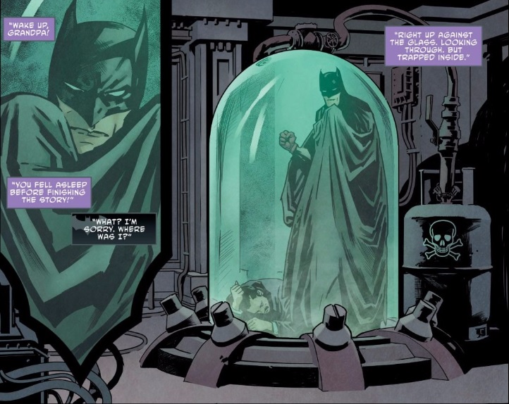Bruce himself is trapped in Barbatos’ proverbial glass dome: he’s watching/living different parts of his history and future, unable to truly affect any of them.