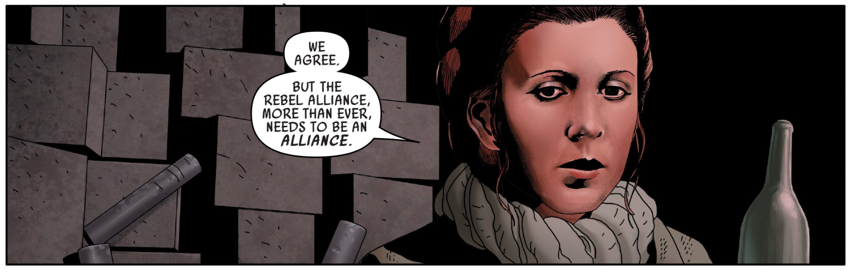 That’s less of a problem when characters are standing around in a room sharing conversation, but more of a constraint during sequences of intense action. The result is that panels featuring Leia, Luke, or Han are either necessarily static— there’s a lot of standing in one place, talking — or great lengths are taken to obscure the characters’ faces when there isn’t an appropriate likeness that can be lifted from the films. Too much of the issue is spent gazing at the backs of heads while dialogue boxes emanate from presumably open mouths.