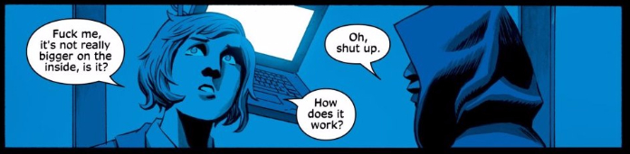 I think the really big thing about this arc is the parallels between the mystery of the Spriggan Town and of Brigid. It is important to note that only at the very, very end of the comic that we get to see the inside of Brigid’s ‘TARDIS’. It is the payoff of the entire arc. The climax of an Injection arc is always a big moment of showing off how weird the Injection really is. SO the fact that Brigid gets a payoff just as weird is important. Which reflects the comparison between Brigid and the Injection as both forces that are making the future more interesting. And again builds that idea that this arc has sold that Brigid is something a bit different to the rest. Where Maria and Vivek were mere improvements on archetypes, Brigid breaks our assumptions.