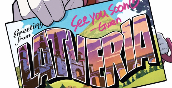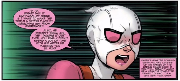 Gwen’s got a handful of new tricks in this issue — the most spectacular of which is her own ability to leave the panel and travel through the gutter to previous pages. This amounts to time travel, and is a near god-tier power. She also leans out of panels to avoid in-coming attacks and seems to have hacked her way into the editors’ notes, so she’s got a direct line to the readers. The tone of those notes is interesting too — upbeat, even when discussing her obviously tumultuous relationship with Vincent or the probably murderous way she’s dealing with Marvel villains.