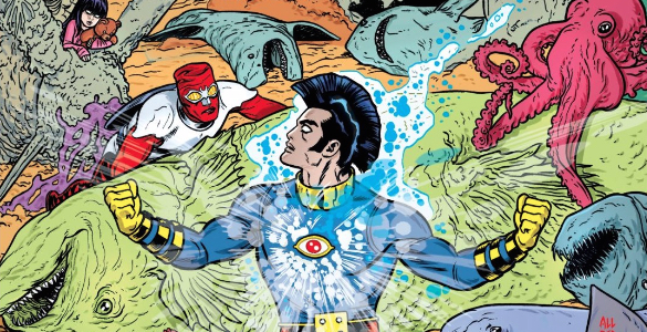 Allred and Allred take Bug and his companions Kuzuko and Teddy Bear on journey from a portal in the sky to a dried up ocean and from one secret lair to another in the span of 25 pages. Modern day comics are typified by their decompressed, slow-burn storytelling, but Bug! The Adventures of Forager 5 swashbuckles from location to location with little time to reflect or focus on the crazy antics that just occurred.